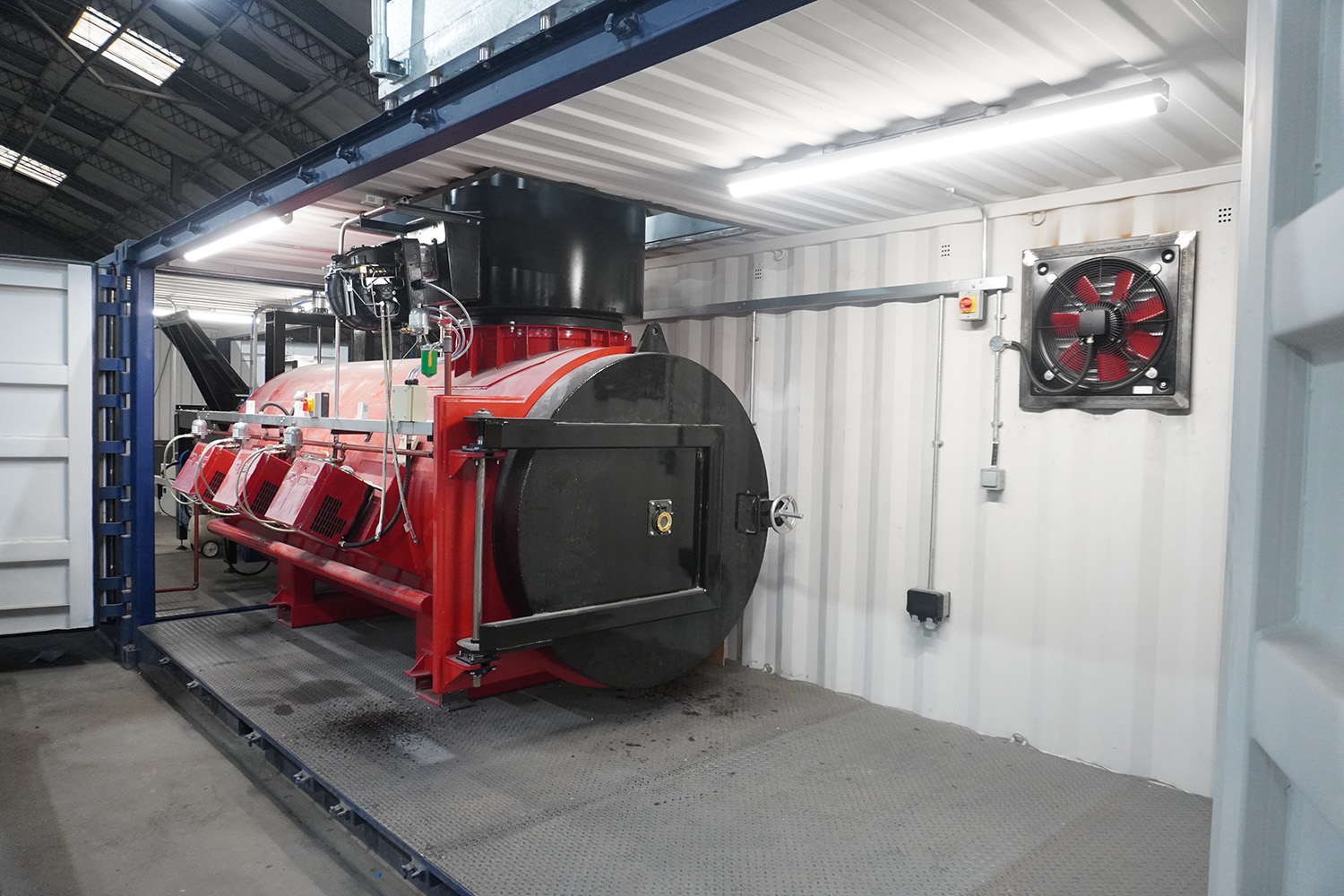 A bespoke version of the G100 high capacity waste incinerator designed to destroy up to 100kg of waste an hour. To achieve these targets it was pre installed in two special adapted and connected 20 ft heated containers, housing the primary incineration chamber, and the automated ram charger, so the waste can be processed continuously without unnecessarily exposing staff to severe weather.